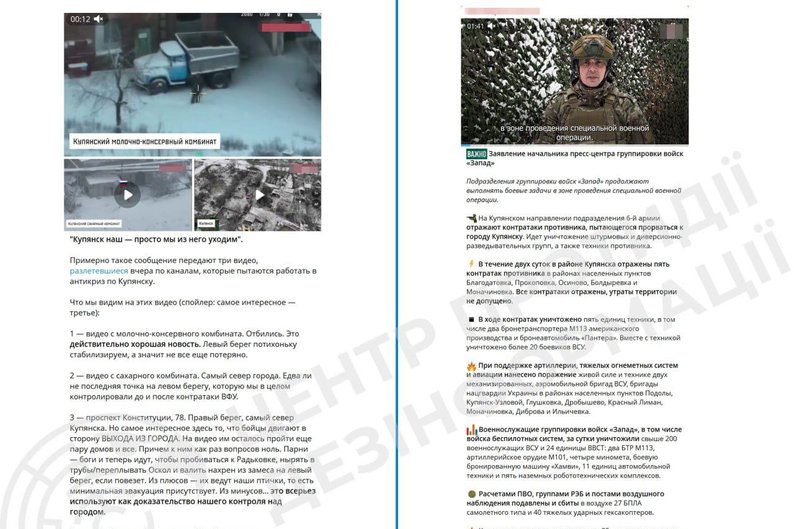 Міністерство оборони РФ продовжує поширювати інформацію про те, що Куп'янськ перебуває під контролем росіян. У Telegram-каналах розповсюджуються відео, знятих із дрона, на яких заявлено, що російські військові пересуваються вулицями Куп'янська. У Центрі протидії дезінформації назвали ці відео маніпуляцією.