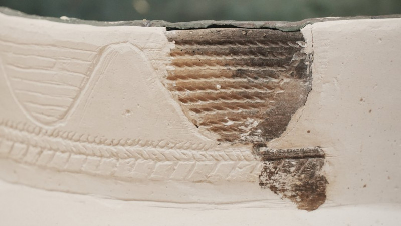 Бачимо різноманітні орнаменти. По-перше, орнамент покривав всю посудину, і тут є наліпні кружки рельєфні, але головний орнамент, різні мотиви, зроблені в техніці відбитків шнура — його прикрашали тим, що придавлювали тасьму, шнур в різних сюжетах.