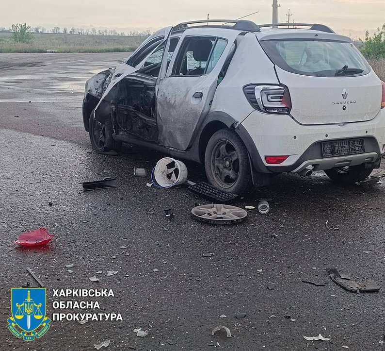 У цивільне авто на дорозі поблизу Великих Проходів Дергачівської громади влучив російський дрон, 8 травня 2025 року. Харківська обласна прокуратура