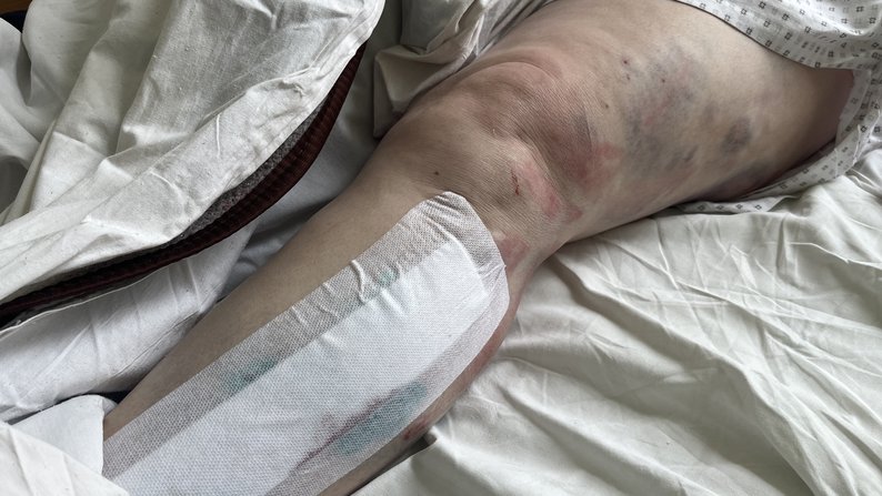 58-річна Марина Голотвіна, в автівку якої поцілив російський безпілотник 8 травня 2025 року у Великих Проходах, зазнала поранення ноги. Суспільне Харків/Дмитро Гребінник