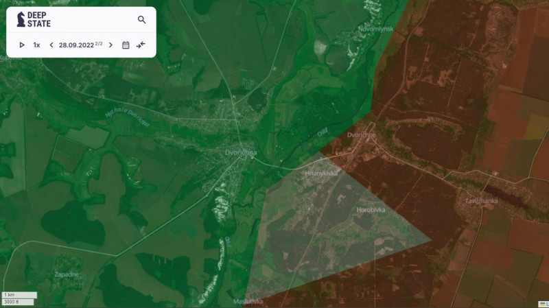 Мапа аналітичного проєкту, на якій село Тавільжанка на 28 вересня 2022 року позначене як окуповане росіянами. DeepState