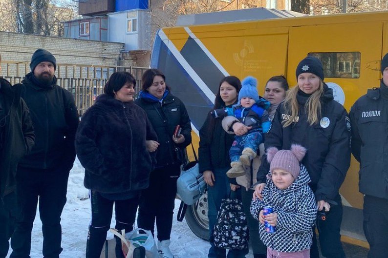 Родини з дітьми, яких евакуювали з Гонтарівки Чугуївського району 9 лютого. Поліція Харківщини