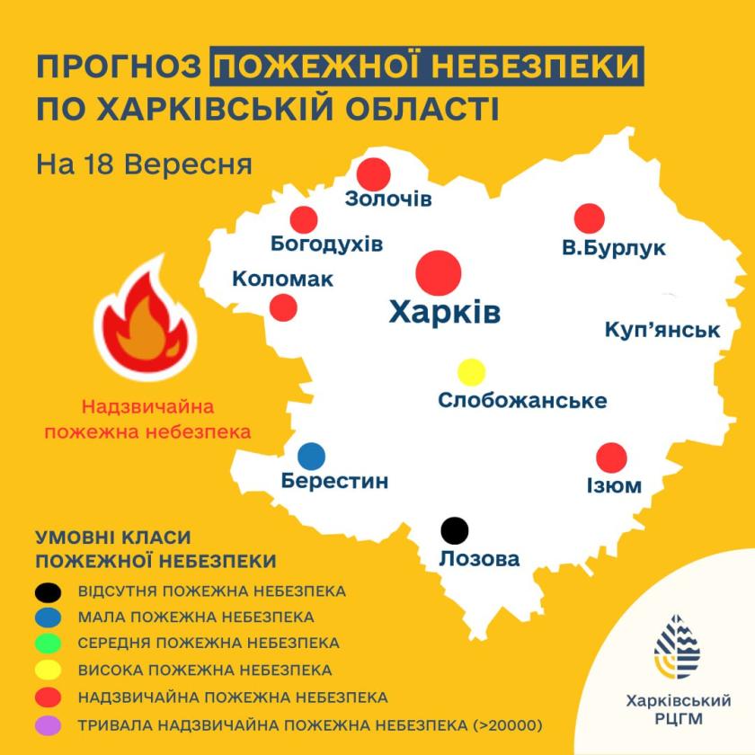 Завтра, крім того, очікується висока пожежна небезпека на більшій частині території області. Лише в Берестинському та Лозівському районах погода не сприятиме пожежам.