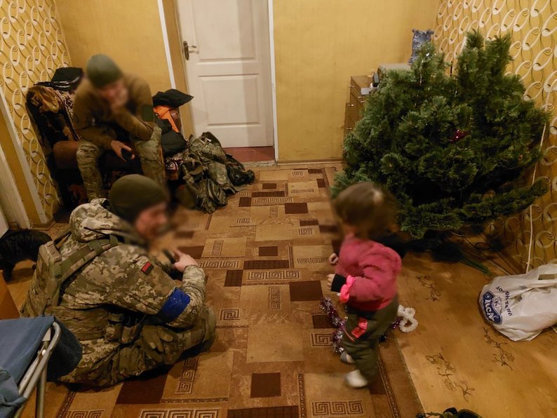 Дворічна дівчинка, яку евакуювали з Купʼянська, з військовими, грудень 2025 року. Пресслужба 127-ї окремої важкої механізованої Харківської бригади