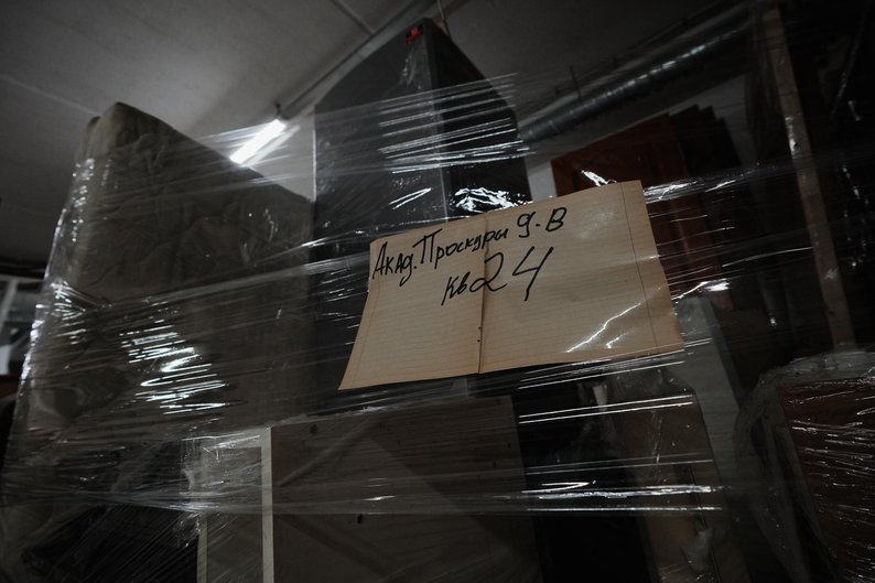 На складі у підвальному приміщенні майно мешканців зберігають під сигналізацією і з цілодобовою охороною, говорить заступник голови адміністрації Київського району Ігор Дроботов. Показує, речі людей тут стоять окремо, і на них є адреса власників.