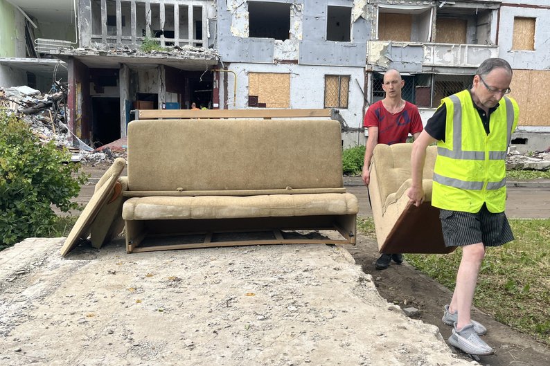 Волонтери виносять речі зі зруйнованого будинку в Київському районі Харкова. Суспільне Харків/Дмитро Гребінник