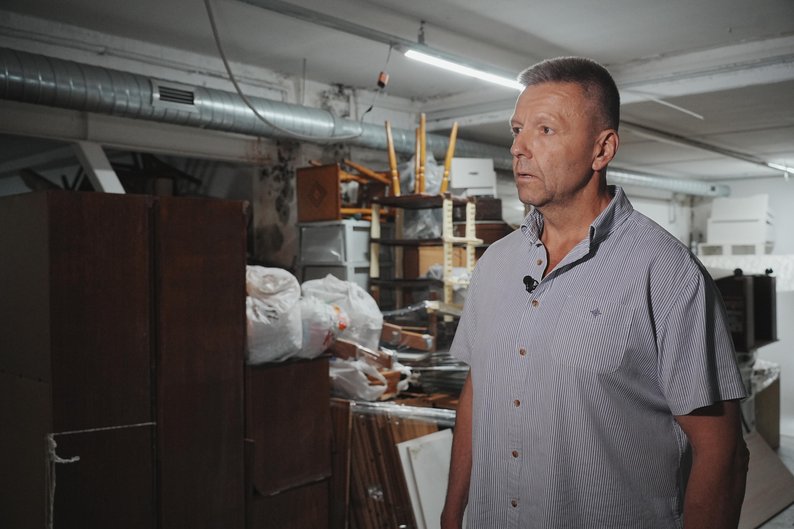"Речі, як ви бачите, зберігаються в сухому вентильованому приміщенні. Це приміщення набагато краще, ніж ті умови, які були в понівечених квартирах мешканців району", — каже Дроботов.