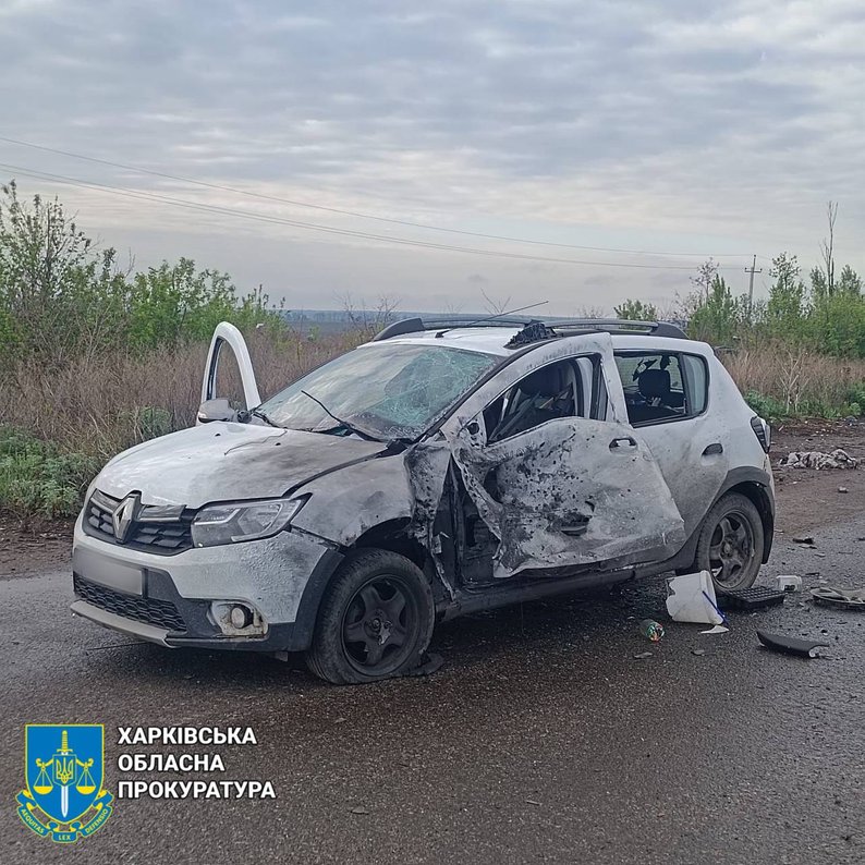 У цивільне авто на дорозі поблизу Великих Проходів Дергачівської громади влучив російський дрон, 8 травня 2025 року. Харківська обласна прокуратура