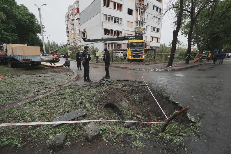 Яма після удару безпілотника на вулиці Велика Панасівська в Холодногірському районі, 6 травня 2025 року. Суспільне Харків/Вікторія Якименко