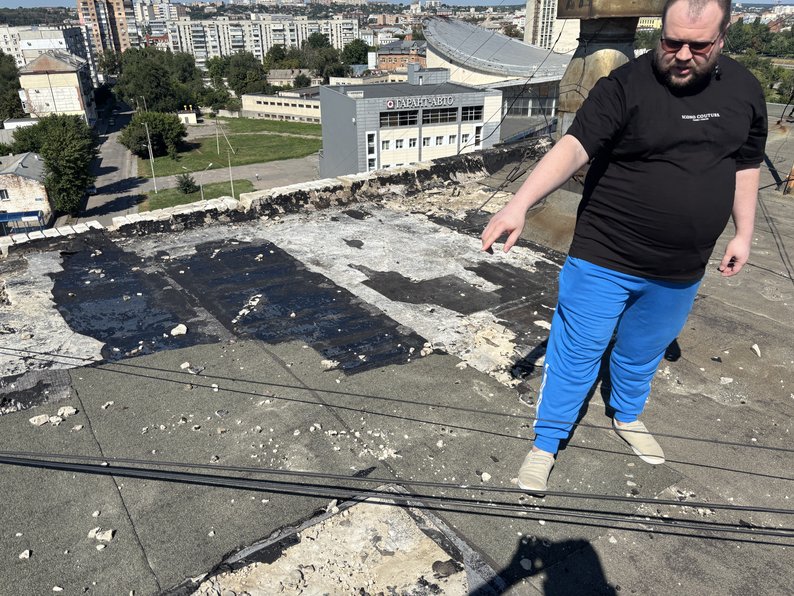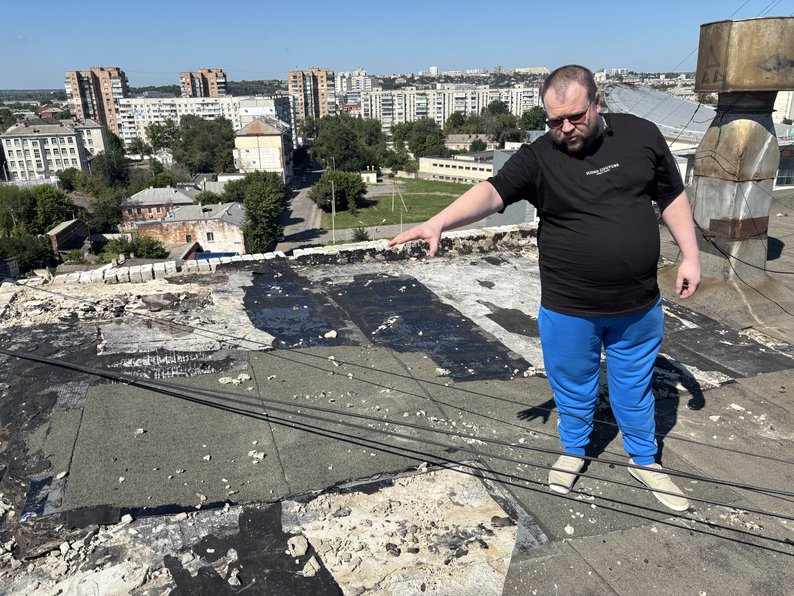 Юрій Івченко показує пошкоджений після буревію дах. Суспільне Харків/Давид Надворний
