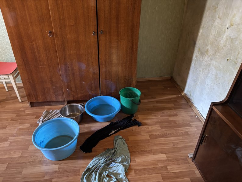 "У нас натяжна стеля, вже п’ятий раз відра приготовлені — зливаємо воду зі стелі, бо набирається, тече. На вихідних, коли дощ був, прямо струменем текло. Я таких маленьких п’ятилітрових відер виніс, мабуть, штук вісім. А коли залило вперше, мені приїхав батько допомагати — ми злили близько 200 літрів води з-під стелі", — розповів харківець.