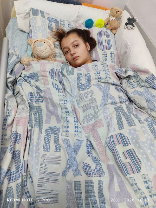 На даний час ми не дуже добре говоримо, не сидимо. У нас не працює права сторона. Нас чекає довга й тяжка реабілітація. Заново ходити, тримати ручку, вчитися правильно говорити — все це нас чекає попереду. Розходження в очах, зір у неї поганий — у неї все двоїться.