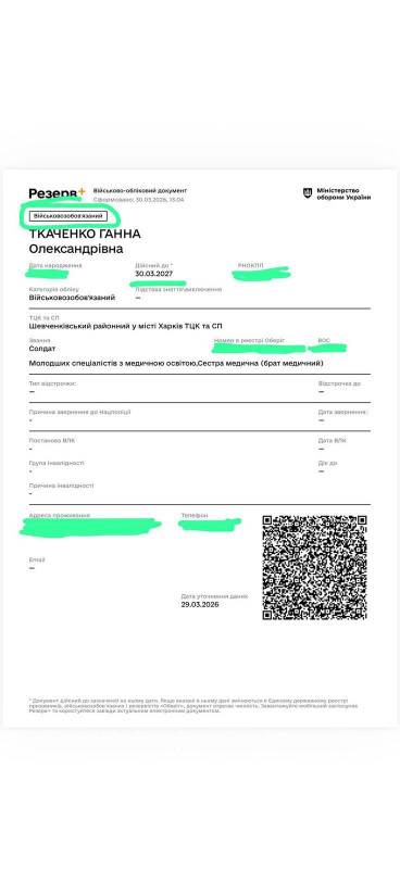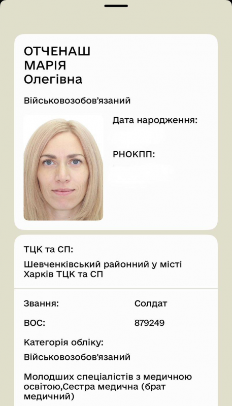 Військово-обліковий документ Ганни Ткаченко із додатка “Резерв+”. Фото надала Ганна Ткаченко
