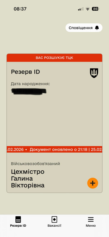 Згодом відкрила “Резерв+” — там, дійсно, була вся моя інформація, всі мої дані. Світилася червоним стрічка, що я в розшуку.