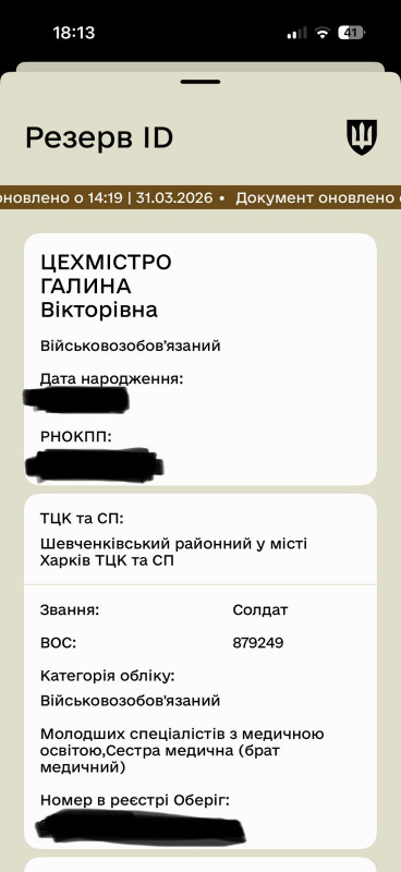 Я перебуваю на військовому обліку військовозобовʼязаних осіб сержантського та старшинського складу. А у "Резерві" я йду як медсестра з медичною освітою. Хоча я нікуди не ходила і нічого не підписувала.