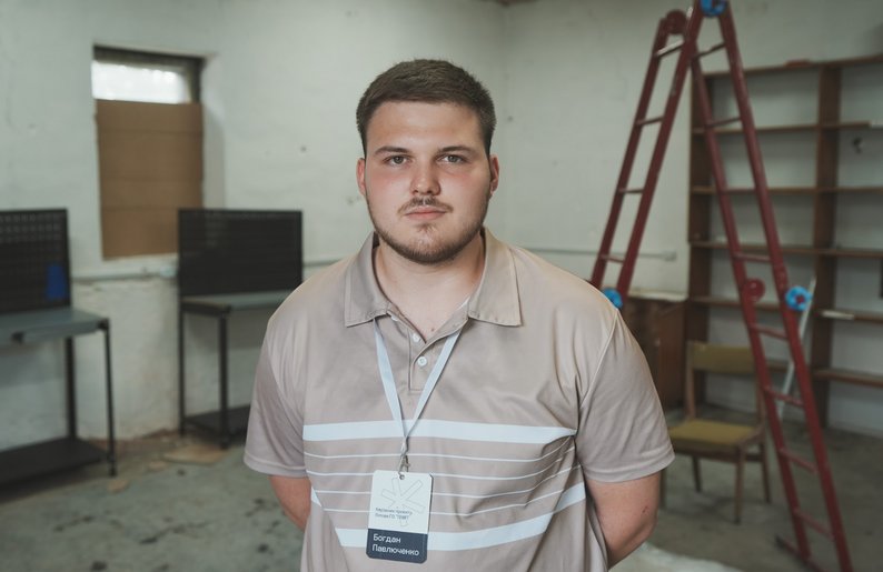 "Приміщення дуже перетворилося для цієї майстерні. Тут було завалено сміттям, машина — на задньому дворі "Москвич" цей стоїть. Ми все звідси винесли. Перефарбували стіни, покрили нагорі все, зробили світло, столи, підлогу — тут взагалі яма була метра півтора", — каже Павлюченко.