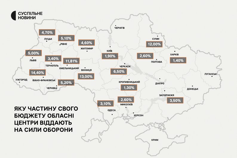 Відсоткова частина від бюджету, що обласні центри спрямують на Сили оборони України. Cуспільне