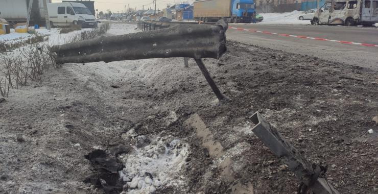 На місце події вранці 20 січня прибули робітники Служби відновлення та розвитку інфраструктури. На фото. які оприлюднила Служба, видно, що пошкодження від удару дрона невелике за діаметром, але досить глибоке. Були також пошкоджені зупинка та огородження вздовж траси.
