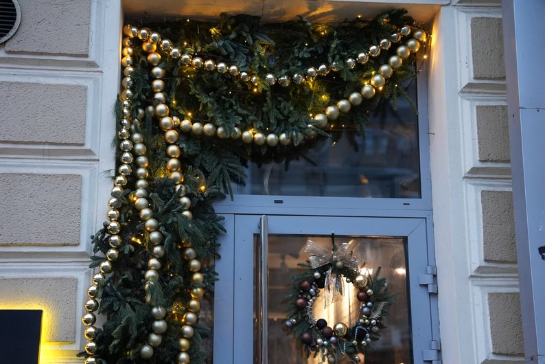 Новорічні прикраси біля входу одного із закладів у Харкові, 17 грудня 2025 року. Суспільне Харків/Олександр Манченко