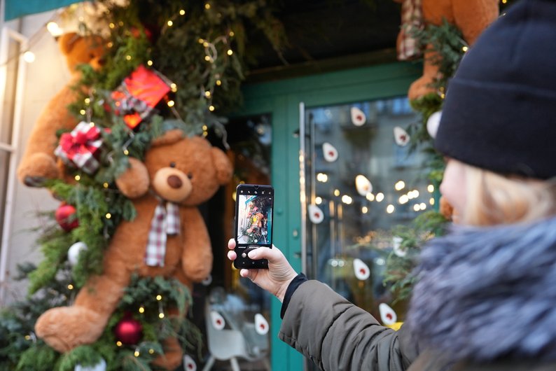 Жінка фотографує новорічний декор біля одного з закладів у Харкові, 17 грудня 2025 року. Суспільне Харків/Олександр Манченко