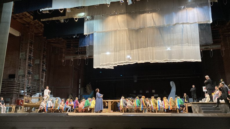 Репетиція на сцені ХНАТОБу. Суспільне Харків/Лариса ГовинаВирішили використовувати ті майданчики, у яких є більш-менш можливість це робити з вимогами безпеки, які дійсно, є. І тому головний репетиційний процес проходить саме на великій сцені. Це наш біль, тому що, дійсно, репетиційний процес і процес наших виступів дуже непростий.