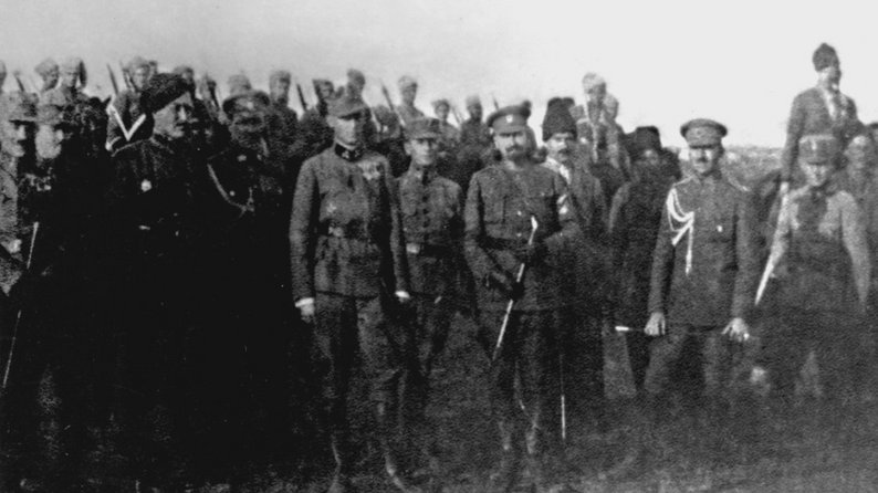Командування Кримської групи та Українських Січових Стрільців в Олександрівську (Запоріжжя), 17 квітня 1918 року. У центрі – Вільгельм Габсбург (у чорному одязі) та Петро Болбочан (із стеком). Фото з книги Сергія Громенка “Забута перемога. Кримська операція Петра Болбочана 1918 року”
