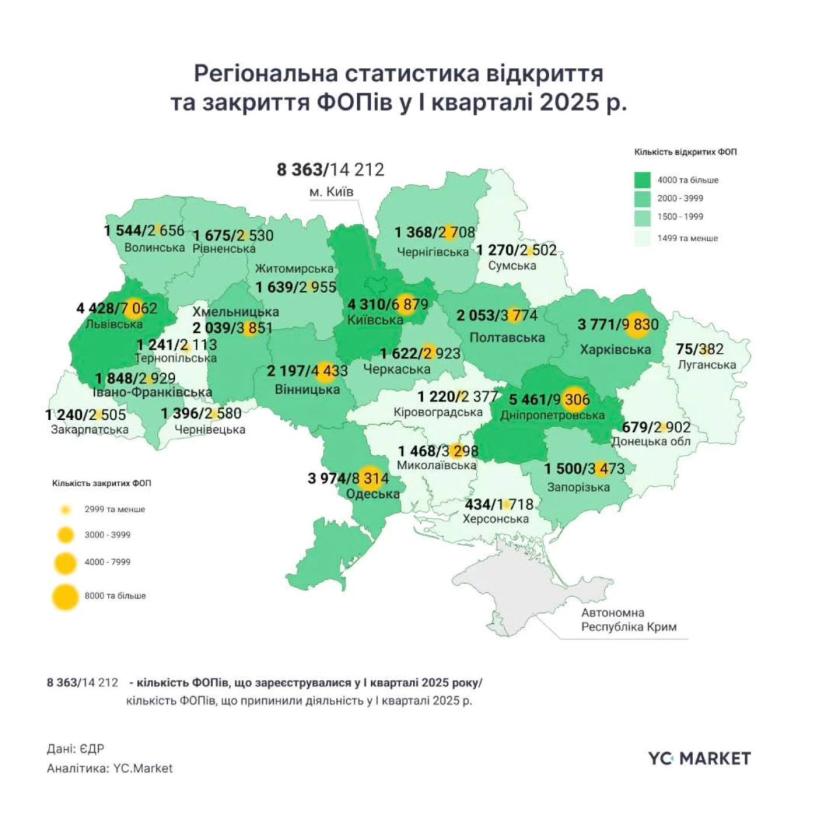 У Харкові та області статистика ще сумніша: за 3 місяці 2025 року закрилися 9830 ФОПів, тоді як відкрився 3771 ФОП. Це найгірше співвідношення в Україні.