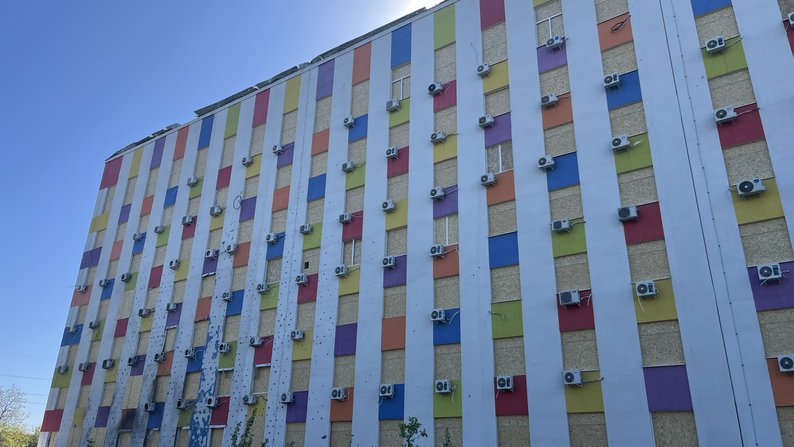 Будівля з вибитими вікнами після удару безпілотника типу “Шахед”, Салтівський район, 3 травня 2025 року. Суспільне Харків/Дмитро Гребінник