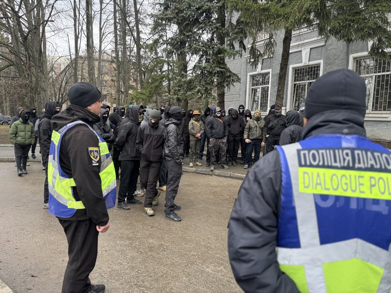 Разом з тим, на вулиці під будівлею суду на акцію протесту зібралося молодики із закритими обличчями та елементами військового одягу. Вони представилися кореспонденту Суспільного як "свідома молодь" та представниками "націоналістичного руху Харкова". За словами одного із чоловіків на позивний "Адвокат", серед протестувальників були неповнолітні.