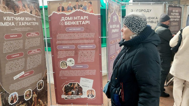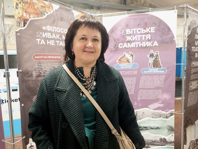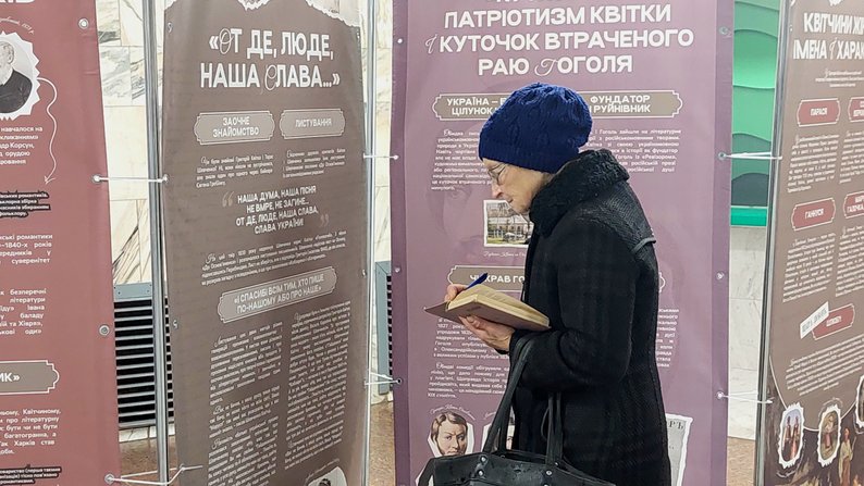 Жінка на виставці “Квітка. Цвіт міста”, присвяченій Григорію Квітці-Основ’яненку, Харків, станція метро “Історичний музей”, 25 листопада 2025 року. Суспільне Харків/Ганна Цьомик