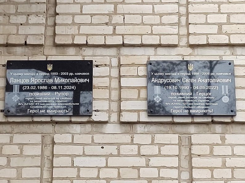 Меморіальні дошки, відкриті на честь випускників Харківського ліцею № 8 Євгена Андрусовича та Ярослава Ланцова, 10 листопада 2025 року . Адміністрація Салтівського району Харківської міської ради