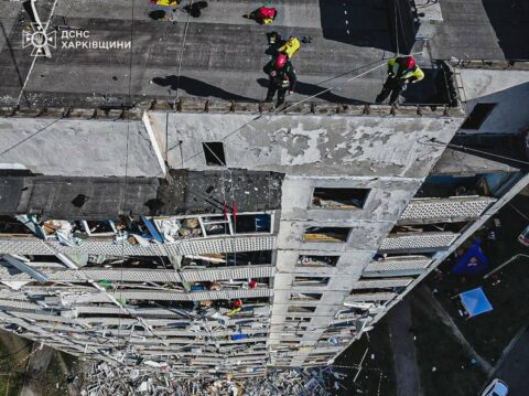 Працівники ДСНС виносять маломобільну жінку з задимленого під’їзду дев’ятиповерхівки в Харкові, де загорілася пожежа, 10 липня 2025 року. ДСНС Харківщини