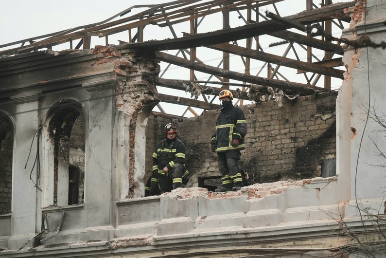 Рятувальники, які розбирають завали у будівлі дитячого садочку, по якій влучив російський безпілотник, 23 жовтня 2025 року. Суспільне Харків/Вікторія Якименко