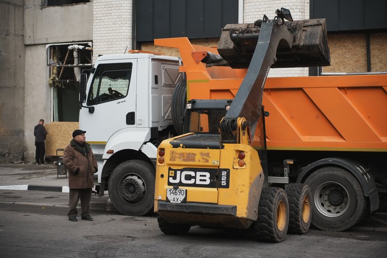 Техніка, яка працює на місці влучання російського безпілотника у дитячий садочок, Харків, 23 жовтня 2025 року. Суспільне Харків/Вікторія Якименко
