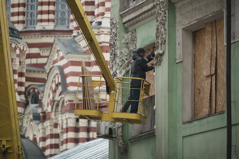 Працівники приватного дитячого садка виносять із приміщень речі, які вціліли, та прибирають сміття.