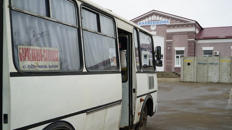 Автобус “Барвінкове-Слов’янськ” біля залізничного вокзалу в Барвінковому, грудень 2025 року. Суспільне Харків/Валерія Ємець