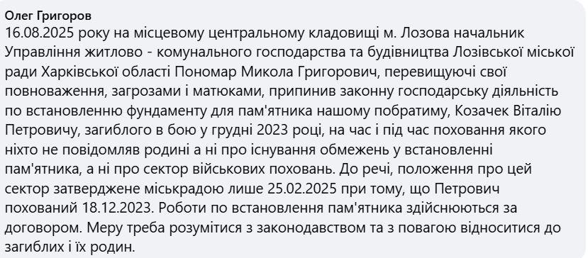 “Розумію, що для пам’яті найріднішої людини хочеться найкращого, однак тут сектор військових поховань – зі своїми нормами. Є чіткі вимоги вже узгодженого та затвердженого проєкту”, — написав мер на своїй сторінці у Facebook.