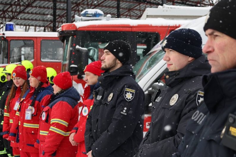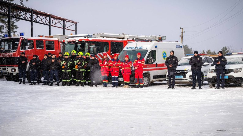 Працівники екстреної допомоги та поліції на відкритті Центру безпеки у Наталинській громаді, грудень 2025 року. Поліція Харківщини