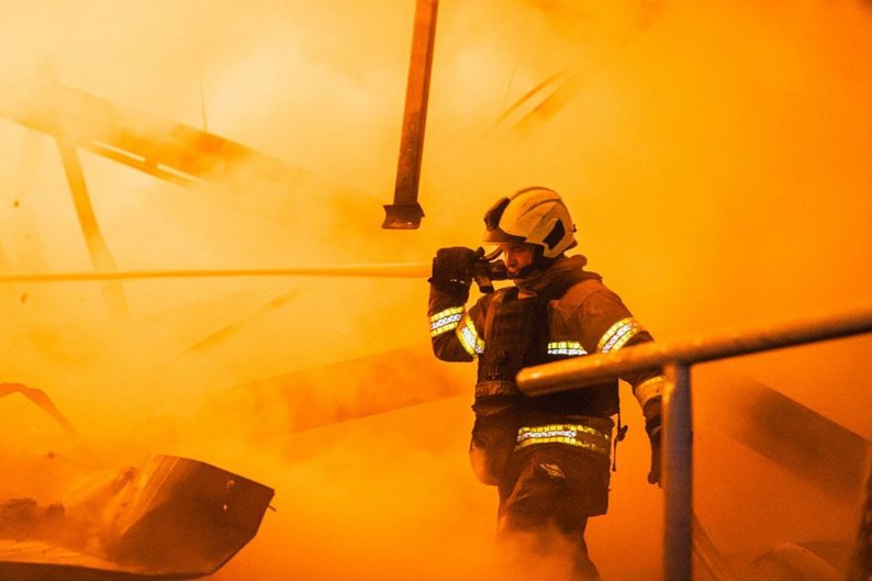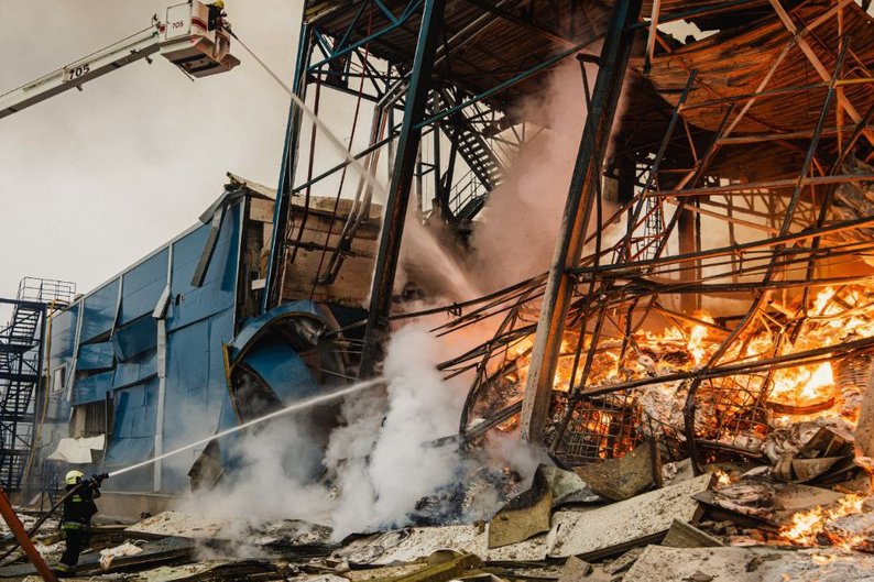 Складська будівля цивільного підприємства у передмісті Харкова зазнала ракетного удару РФ. Внаслідок влучання будівля загорілася: виникла пожежа площею понад 5000 кв. метрів.