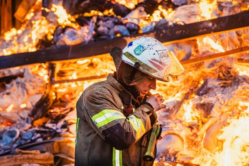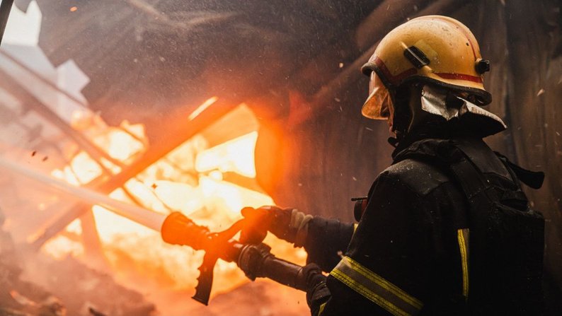 Рятувальник гасить пожежу, що виникла внаслідок ракетного удару РФ по складській будівлі цивільного підприємства у передмісті Харкова, 30 січня 2026 року. ДСНС Харківщини