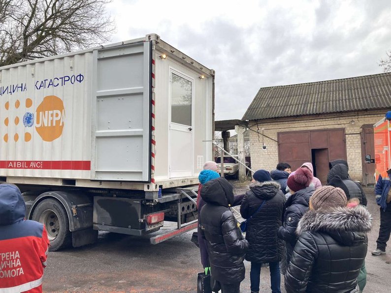 Жінки стоять в черзі на прийом біля машини мобільної гінекологічної бригади. Фото надав проєкт “Мобільні бригади сексуально-репродуктивного здоровʼя”