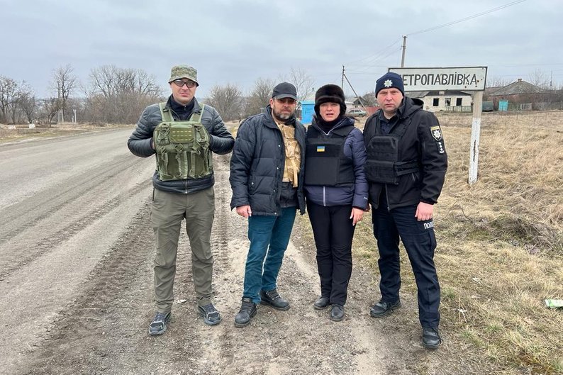 Ольга Козирєва разом з волонтерами та поліцією під час доставки гуманітарної допомоги до Петропавлівки, березень 2023 року. Поліція Харківщини