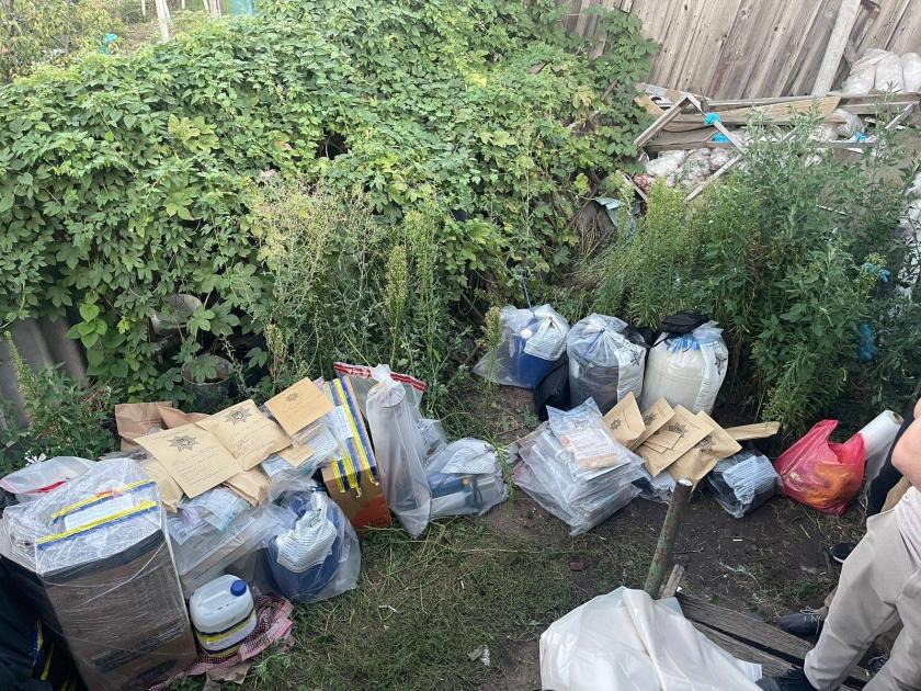 Слідчі вилучили 11 кілограмів готових психотропів та чотириста літрів сировини для їхнього виробництва., обладнання та гранату Ф1.