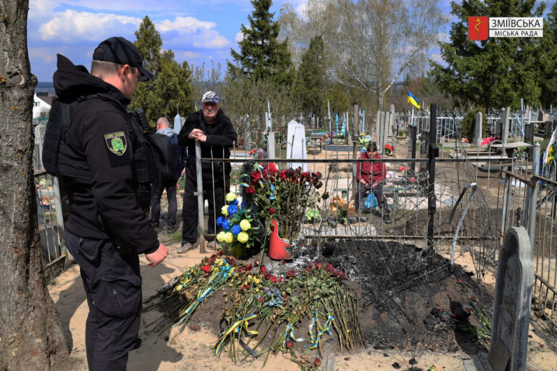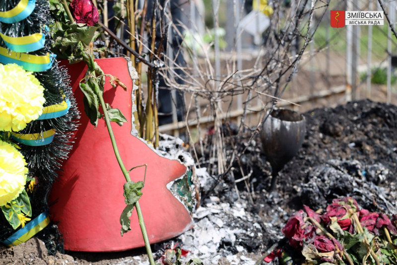 Наслідки пожежі на могилі військового у Змієві, 13 квітня 2026 року. Зміївська міськрада/Facebook