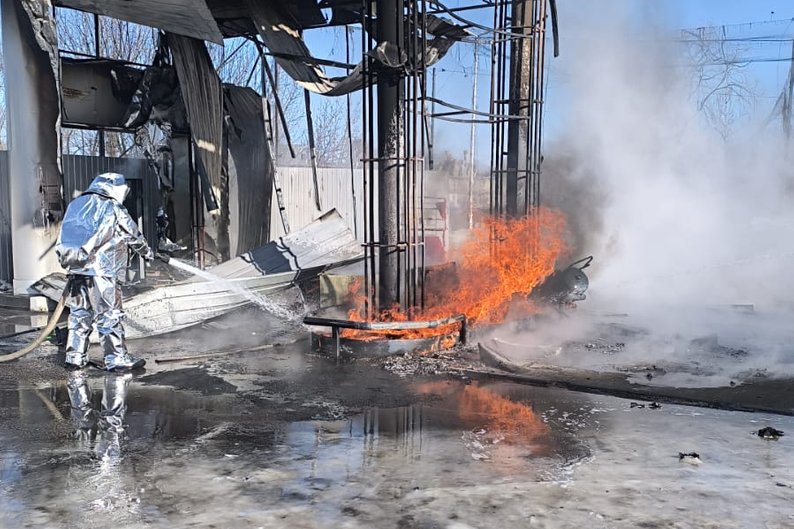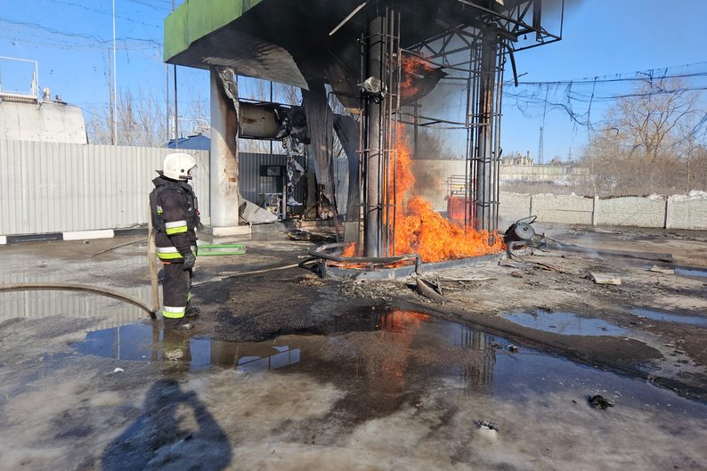 Рятувальники гасять пожежу на АЗС в Золочеві, яка зайнялася внаслідок влучання російського дрона, 10 лютого 2026 року. ДСНС Харківщини