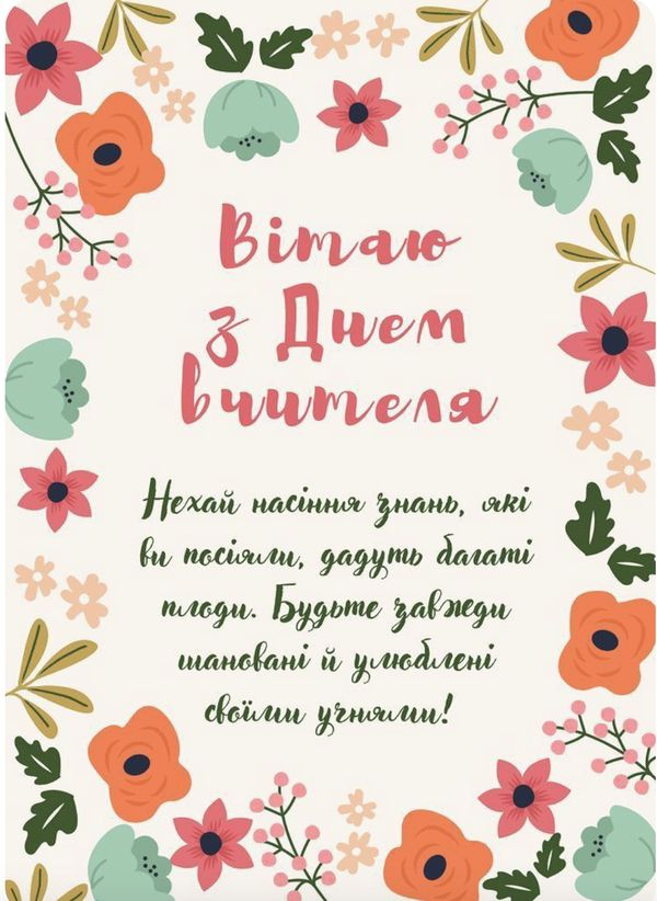 Вітаю Вас із чудовим святом – Днем вчителя. Бажаю завжди зберігати в душі любов до своєї важкої, але такої важливої і потрібної професії педагога. Нехай наснаги додають Вам любов і повага Ваших учнів, гордість за їхні успіхи та здобутки, в яких чимало і Вашої заслуги. Будьте бадьорі та здорові. Оптимізму Вам і душевної рівноваги. Будьте щасливі, зі святом!