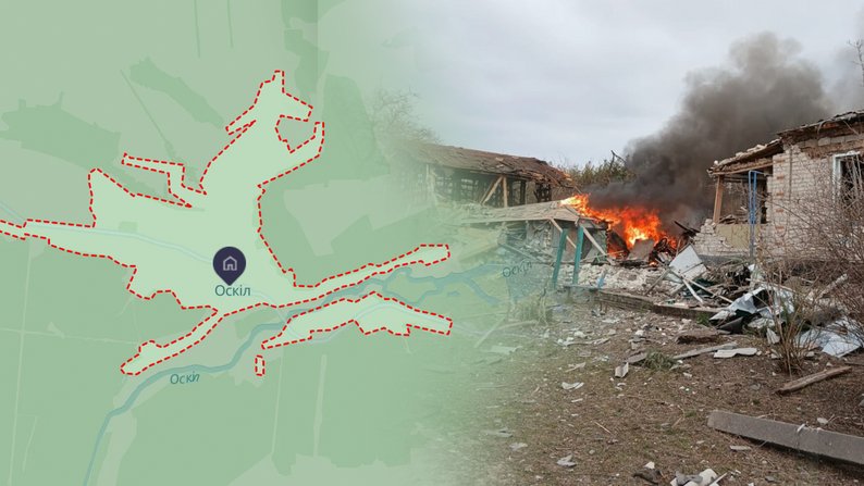 Оскіл на мапі та наслідки російської атаки в селі 26 березня. Deepstate/Геннадій Загоруйко
