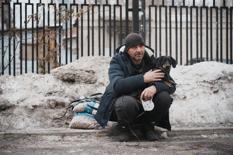 Чоловік з собакою, якого евакуювали волонтери, Харків. Суспільне Харків/Вікторія Якименко