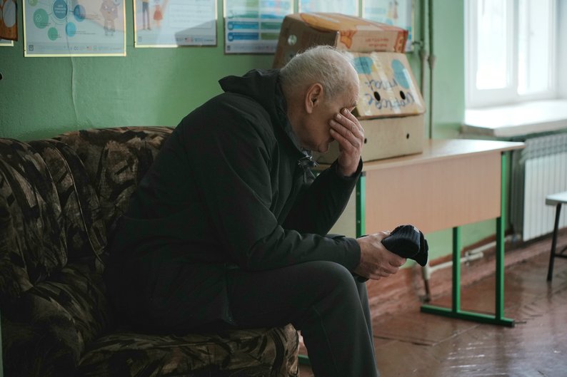 Чоловік, якого евакуювали, у Координаційному гуманітарному центрі. Суспільне Харків/Вікторія Якименко