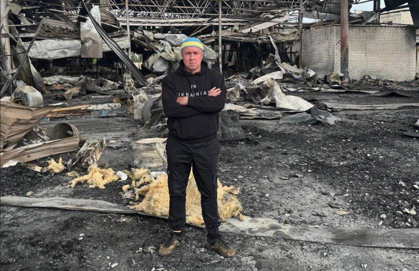 Олександр Тимофеєв стоїть на згарищі свого цеху. Фото зі сторінки О. Тимофеєва у Facebook